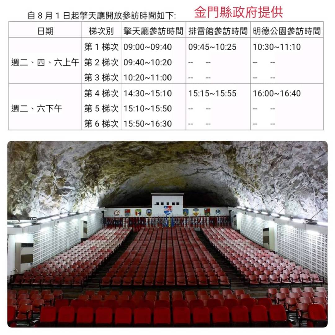 縣府觀光處處長丁健剛指出,位於太武山花崗岩坑道內可容納上千人的軍事景點擎天廳,因渾然天成的壯觀景色,以及鬼斧神工的宏偉建築,一直是來金遊客參訪的熱門景點,自去(110)年5月10日因應疫情封閉迄今,旅行業者及民眾詢問度不斷,經縣府積極與軍方溝通協調,獲軍方同意將自8月1日起恢復開放;同時縣府將配合軍方及中央疫情指揮中心最新防疫規定,滾動修正擎天廳開放辦法。