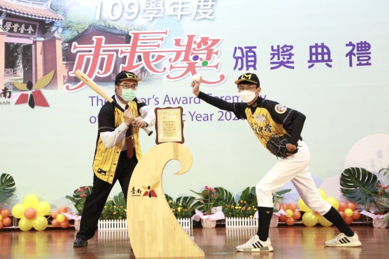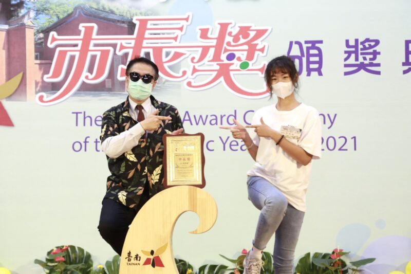 今日受獎同學發揮多元創意,有人和市長合比愛心、金雞獨立、朝天蹬及爆紅的反轉YA,也有同學帶羽球拍、桌球拍、電吉他、猩猩布偶等各式物品與市長合影,黃偉哲更配合穿棒球服擺出揮棒動作,甚至配合跆拳道選手腳踢木板,可說是使出渾身解數,也讓現場歡笑聲不斷,為畢業生留下快樂且深刻的回憶。