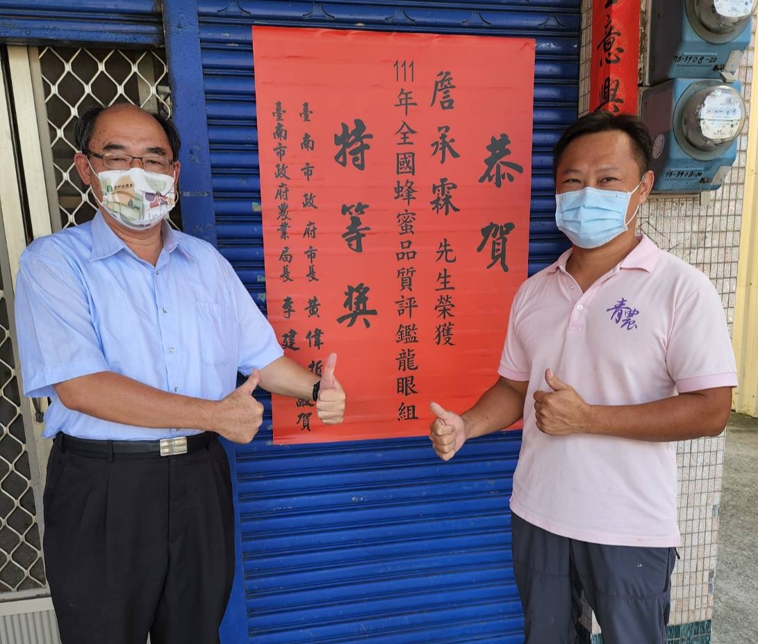 【大成報/記者于郁金/臺南報導】111年全國龍眼蜂蜜品質評鑑,臺南市有4位蜂農獲得特等獎,昨(11)日農業局代表臺南市長黃偉哲前往張貼紅榜祝賀。黃偉哲表示,今年蜂蜜雖受氣候影響產量,但得獎農友蜂產品擁有產銷履歷認證,品質獲肯定,向大家推薦南得極品優質好蜜,數量有限,欲購從速。