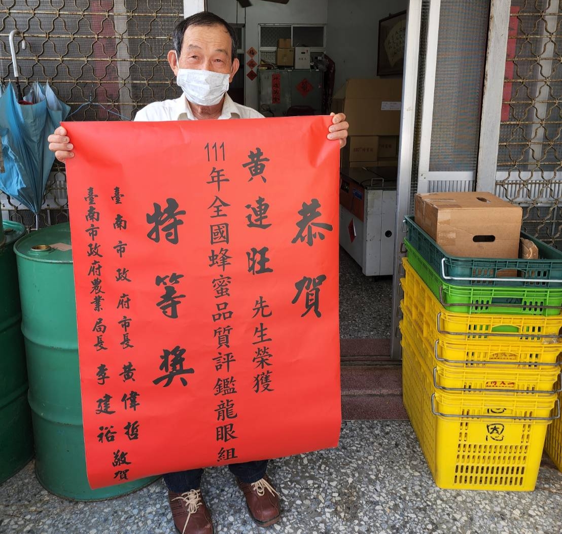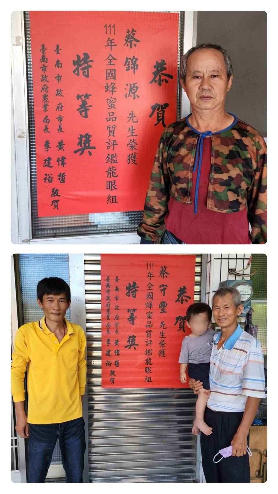 農業局指出,東山區蜂農詹承霖參加全國龍眼蜂蜜評鑑,99年到105年連續7年頭等獎,去年終於拿下特等獎,今年再度連莊,連續2年獲得特等獎;麻豆區蜂農黃連旺95年首次參賽即獲特等獎,之後連年得到頭等獎,今年終於再次獲得特等獎;特別的是,黃連旺家族自日治時期開始養蜂產業,目前傳承到兒子黃聖恩已是第4代;楠西區蜂農蔡錦源今年則是第4次特等獎,與同獲頭等獎的蔡武智是父子檔;楠西區蜂農蔡守豐之前參賽獲7次頭等獎,今年首獲特等獎。