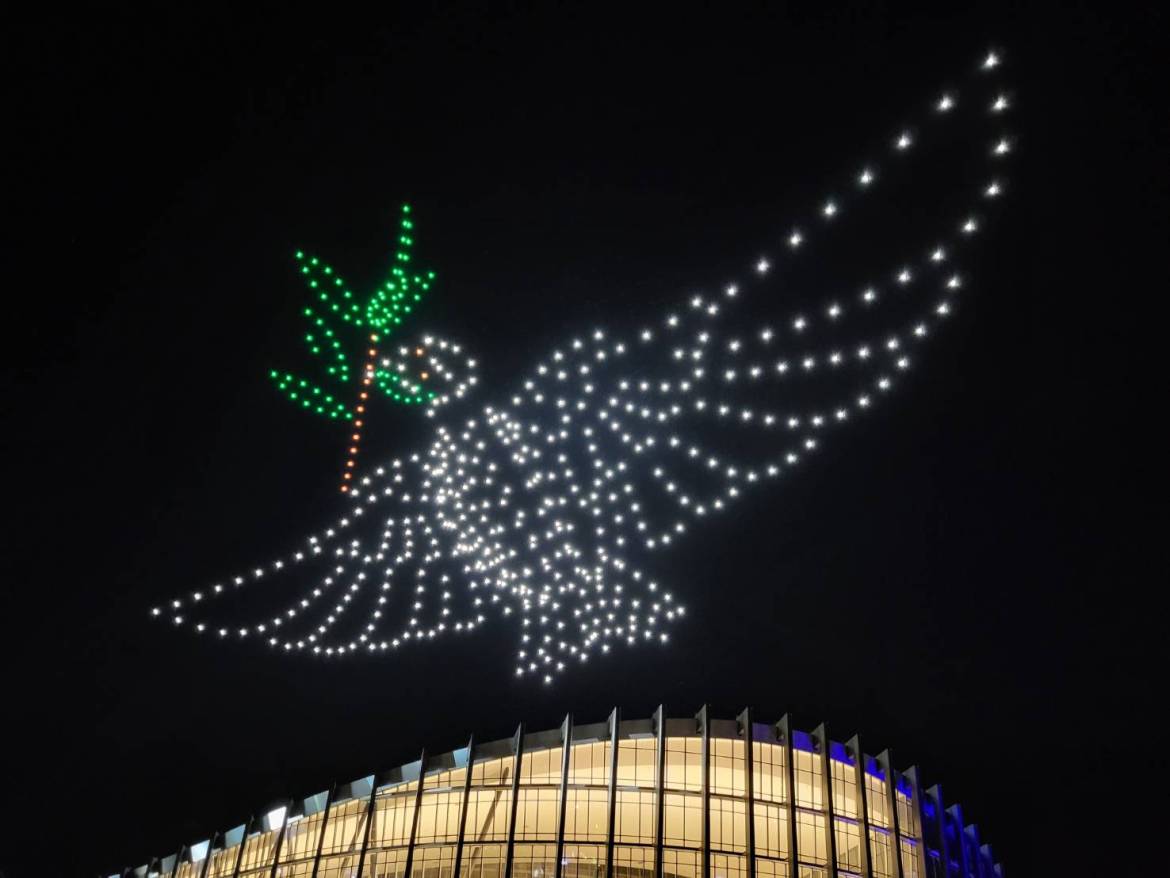 (民生好報記者 邱嘉琪 嘉義報導)故宮南院「仲夏平安夜」首場無人機展演16日夜間璀燦登場,500架無人機以故宮國寶文物圖案搭配聲光水幕秀於水空交映呈現,壯觀精彩,吸引兩萬人前往欣賞,過程中驚嘆聲不斷。