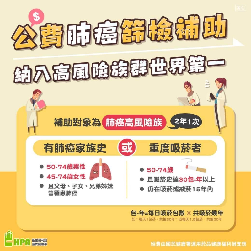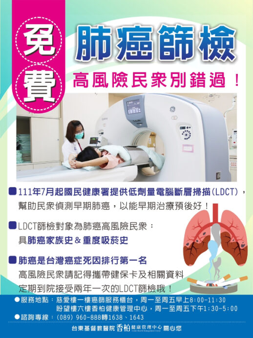 衛生局指出,自7月1日起,癌症篩檢又多了一項新的肺癌免費篩檢政策,凡是符合下列任一肺癌高風險族群對象:1.具肺癌家族史:50至74歲男性或45至74歲女性,且其父母、子女或兄弟姊妹經診斷為肺癌之民眾;2.重度吸菸史:50至74歲吸菸史達30包-年以上,有意願戒菸或戒菸15年內的重度吸菸者,也可洽詢台東基督教醫院預約檢查。