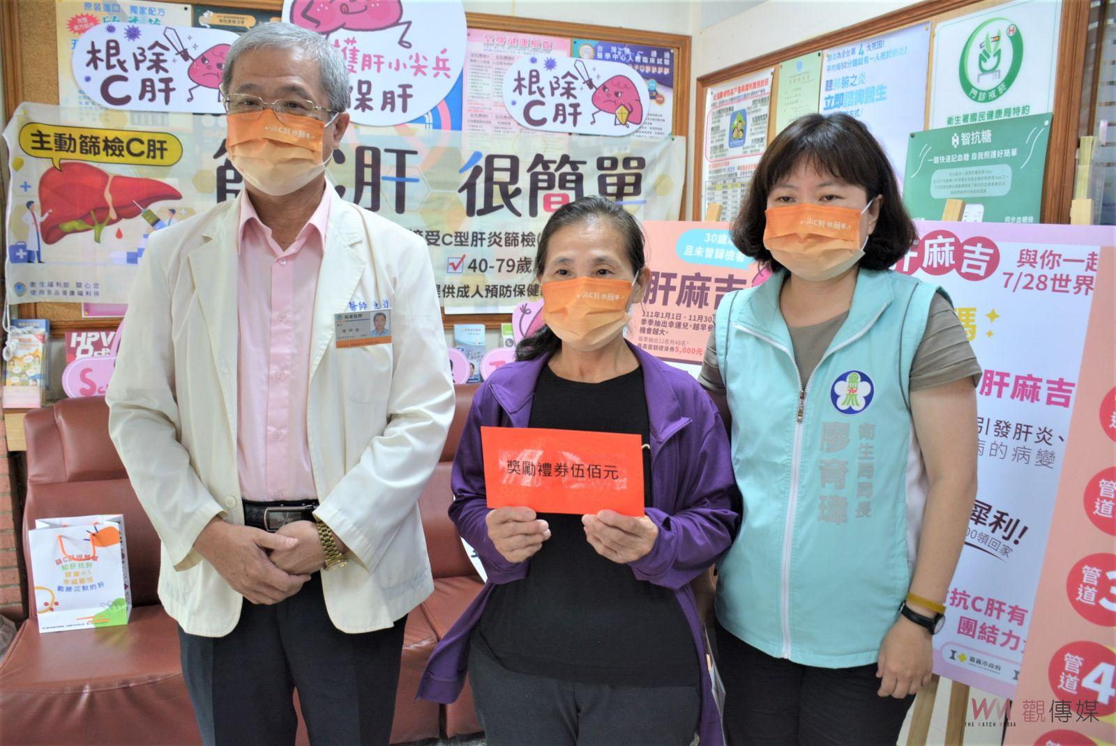 陳明煌醫師今分介紹享廖陳淑華女士C肝個案,因廖陳女士的先生於109年C肝治癒後,廖女士也來篩檢,發現C肝後,經由陳醫師的衛教,按時接受口服病毒藥物治療3個月,血中病毒完全消除恢復健康,今天回診領取500元禮券獎勵;廖陳淑華女士也說很感謝陳醫師幫忙他把健康找回來,並強調C肝治療很簡單,找回了寶貴的健康,又能得到禮券覺得很幸運。