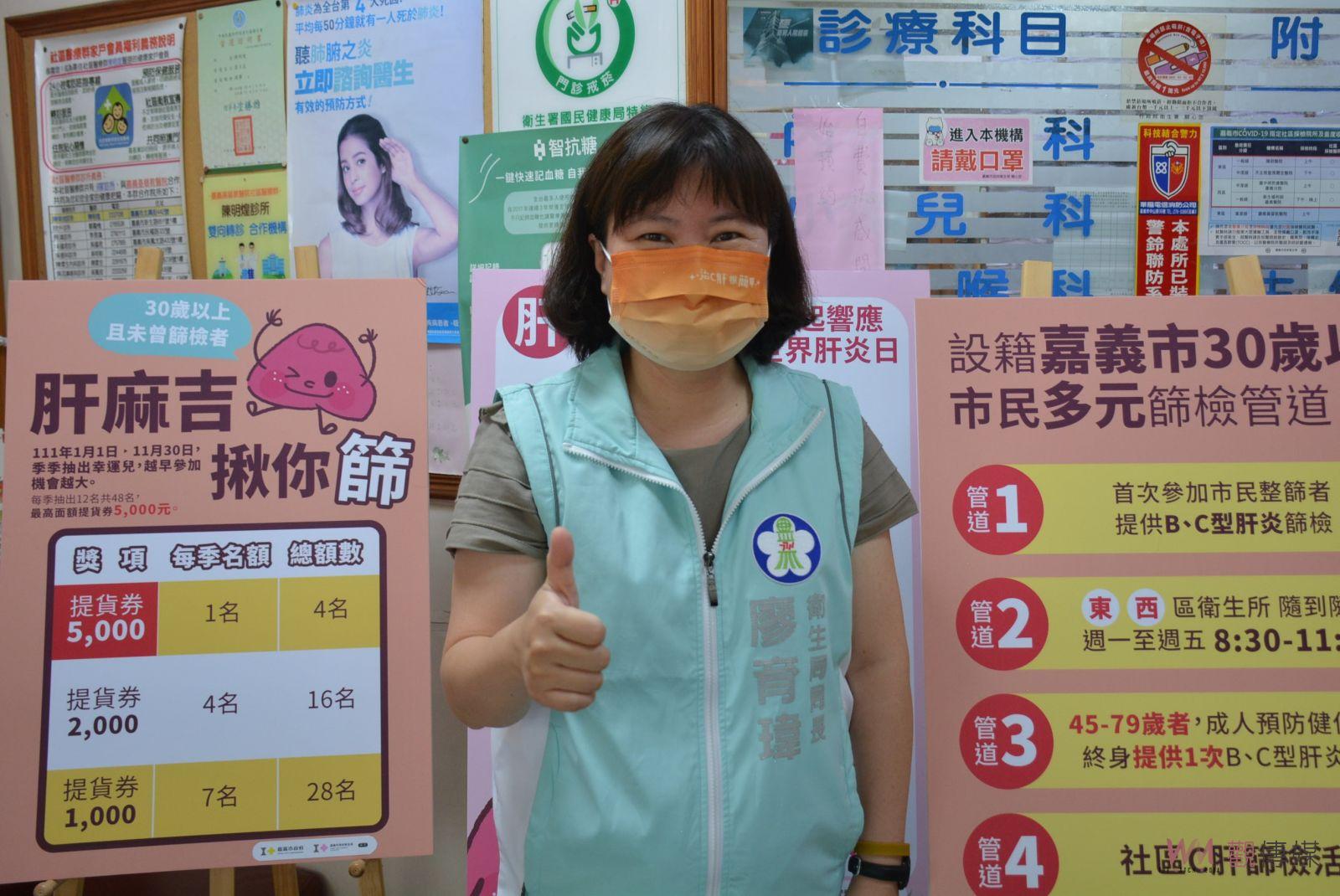 嘉義市衛生局廖育瑋局長表示,依據衛生福利部統計國內每年因慢性肝病、肝硬化及肝癌死亡約13,000人,肝癌更是高居癌症死因第二位,感染B、C後每4人有1人會變成肝硬化,肝硬化後每20人有1人會併發肝癌,是造成慢性肝病與肝癌死亡的主要原因,目前嘉義市30歲以上市民每10人有3人未篩檢C型肝炎,籲請還未篩檢過C型肝炎之市民,可利用嘉義市提供的5個篩檢管道,包含國健署成人預防保健醫療院所、市民整合性健康篩檢、東、西區衛生所週一到週五上午隨到隨檢、社區C肝篩檢活動、企業揪團專案篩檢等接受免費篩檢,如篩檢結果為C型肝炎抗體陽性且血液中有C型肝炎病毒者,請依醫師指示完成C肝藥物治療療程及定期追蹤,即可領取「嘉有好禮 C力犀利」專案500元禮券。