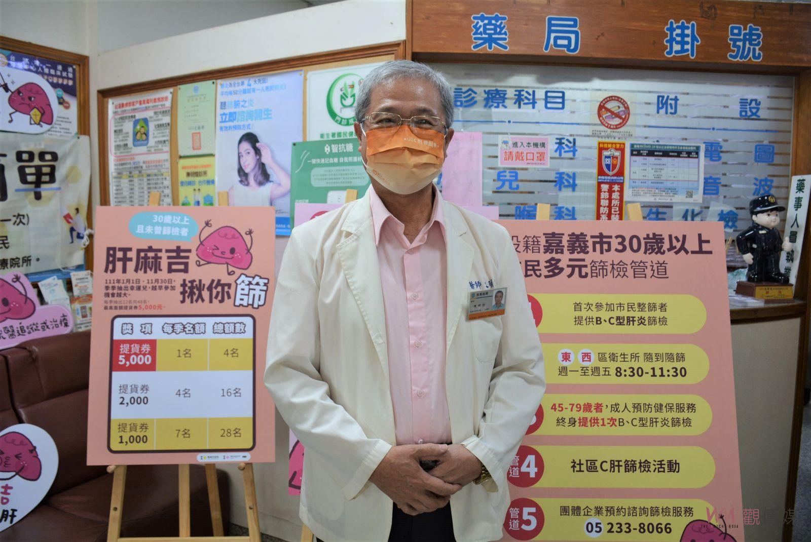 嘉義市診所協會理事長陳明煌醫師呼籲民眾消除C肝就要從篩檢C肝開始,他說現在治療C肝真的很簡單,只要檢查出血液中有病毒,即可使用健保口服新藥治療C肝,相當於政府送20萬元大禮幫忙把C肝治療好,約3個月治療期,副作用小,98%以上的人可以治療好。