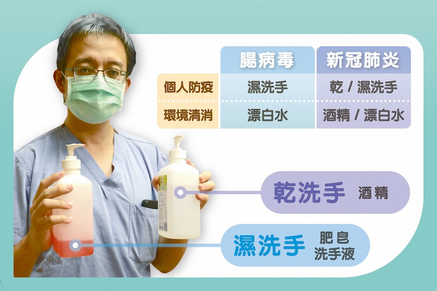 黃禹銘醫師說明:「新冠肺炎病毒、腸病毒是兩種構造不同的病毒」,新冠肺炎病毒有外套膜,用酒精就可以殺死,所以勤於酒精乾洗手就有用;腸病毒沒有套膜必須用消毒能力更強的肥皂、洗手液濕洗手才行。他建議同時有新冠疫情與腸病毒的流行期,環境許可時,使用效用更廣的濕洗手。