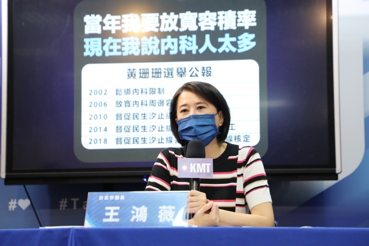 王鴻薇說,黃珊珊過去不斷要求內科提高容積率、樓地板面積,讓內科可以容納更多人,「凡走過必留下痕跡」。黃珊珊作為內湖南港議員,應該全力督導內湖交通,去推給馬英九,是現在的黃珊珊副市長打臉過去的黃珊珊議員,根本自相矛盾。
