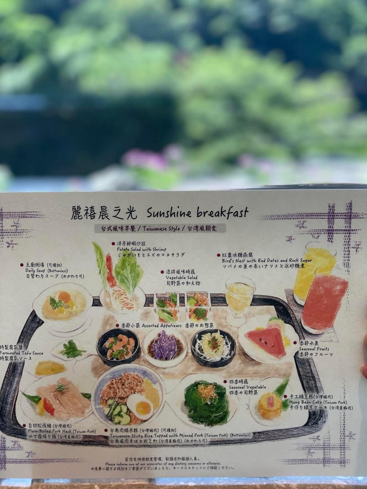麗禧夏末歇心微旅的重點,為中餐廳推出新款的台式晨之光早餐,由雍翠庭主廚黃胤凱運用台菜新作巧思,在專業營養技師的輔助調配下,以台南肉燥米糕為主體,點綴發想自昔日辦桌文化裡,令人印象深刻的龍蝦沙拉以及白切腐乳醬松阪豬等佐菜,結合當季時令胡麻蔬菜,再加上傳統待客上賓的紅棗冰糖燕窩、古早味肉鬆揉合而成的特製鹹甜南瓜子綠豆糕,早晨以客製化的台灣人情味與活力來源,喚起貴賓的閒適好心情。