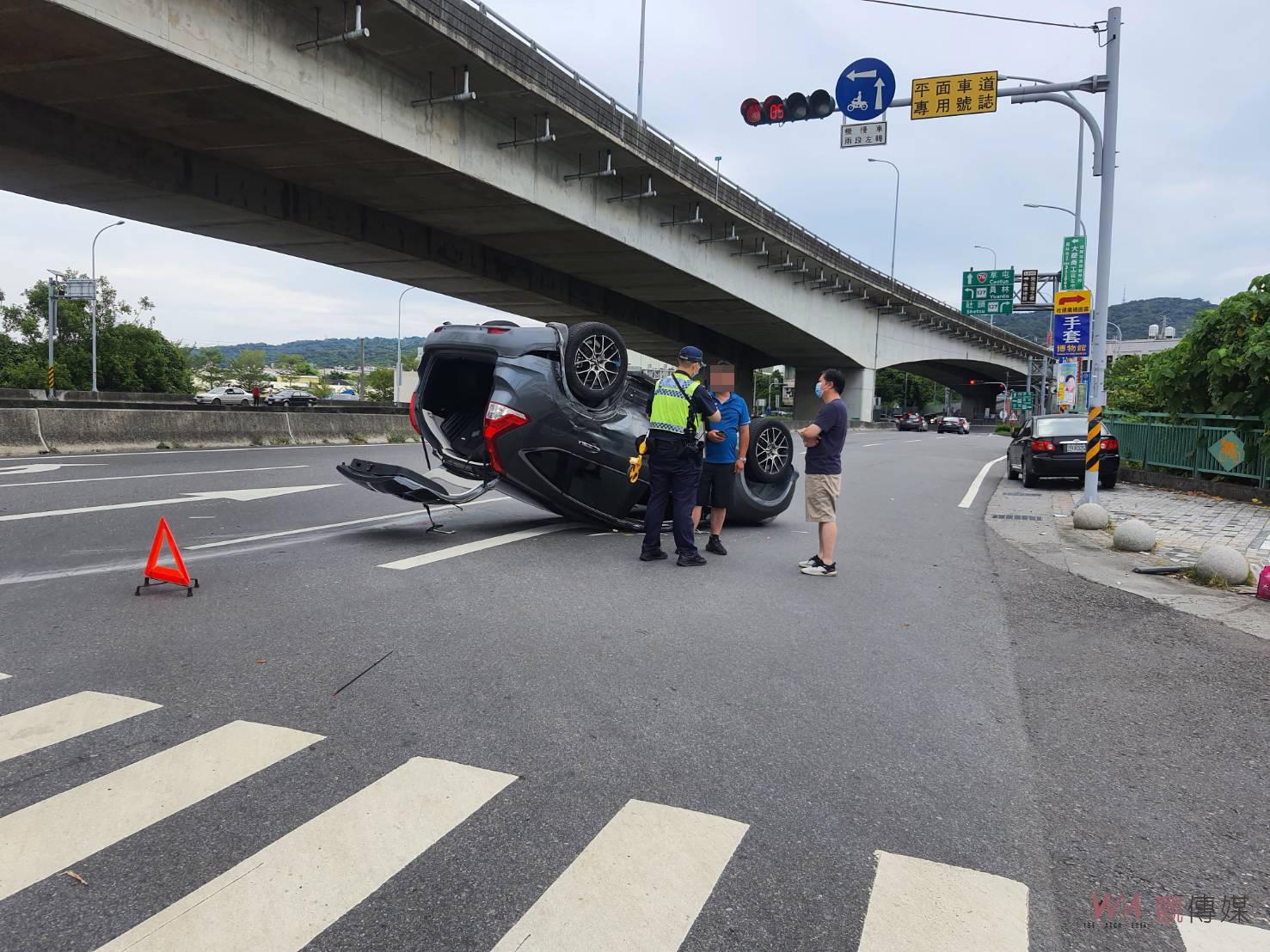 警方表示,其中CRV被撞飛翻覆,四輪朝天,幸好該車駕駛僅受輕傷,自行就醫,目前已無大礙,,車禍在9點40分已排除,肇事責任釐清中。警方說,該路口交通流量大,駕駛行經該路口一定要放慢速度注意。