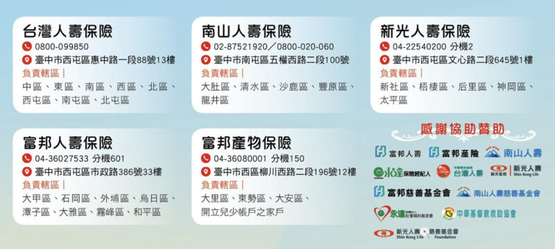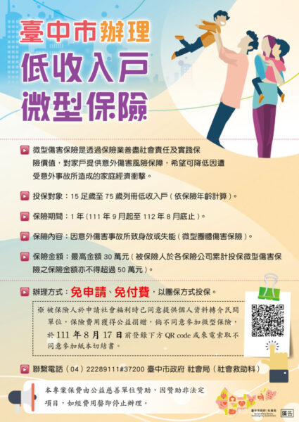 台中市社會局說明,2022年第3年媒合富邦慈善基金會、南山人壽慈善基金會、永達社會福利基金會、中華基督教救助協會、新光人壽慈善基金會、富邦人壽保險、富邦產物保險、台灣人壽保險、南山人壽保險、新光人壽保險及永達保險經紀人,共11家單位公益捐助約670萬元,提供低收入戶1年期微型保險。