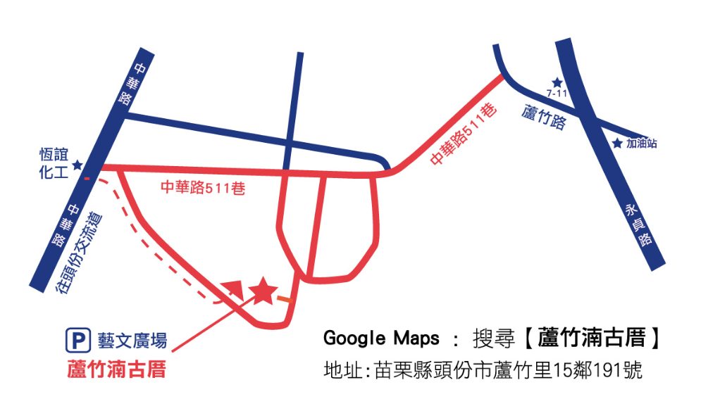 | 交通資訊~ 自行開車:GOOLE MAP搜尋【蘆竹湳古厝】 地址:苗栗縣頭份市蘆竹里15鄰191號 (有免費停車場) 國道1號:國道1號:【頭份交流道】下來後左轉,沿中華路直行,遇臺灣中油頭份加油站靠右行駛[自強路] 國道3號:Google Map【恆誼化工】或依照上方自行開車路線,停放於中華路上 大眾運輸:台鐵【竹南火車站】 → 東站轉乘苗栗客運【5802】【5803】→中華路【恆誼化工】站下車(車程約15-20分鐘) → 步行進入社區(約7分鐘) *社區內目前無YouBike停靠站*