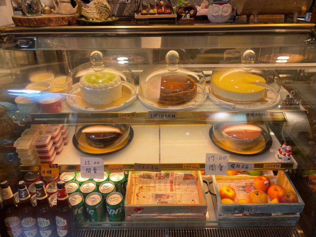 冷藏櫃裡放著當日供應的甜點蛋糕。