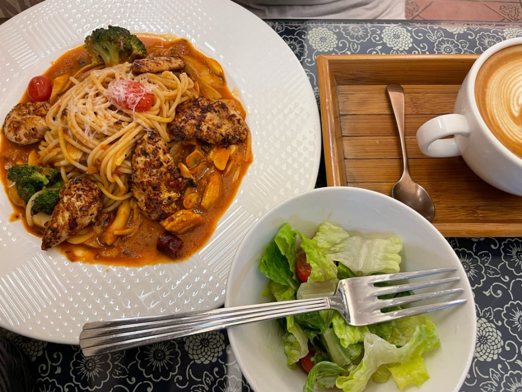 在鄰近青草湖有家【轉角726 ,手工咖啡】,口碑很不錯,聽說很有名的是窯烤比薩,但是當天中午沒有供應,只有晚上有! 我們點了一 大利麵和燉飯,但是口味也很不錯!