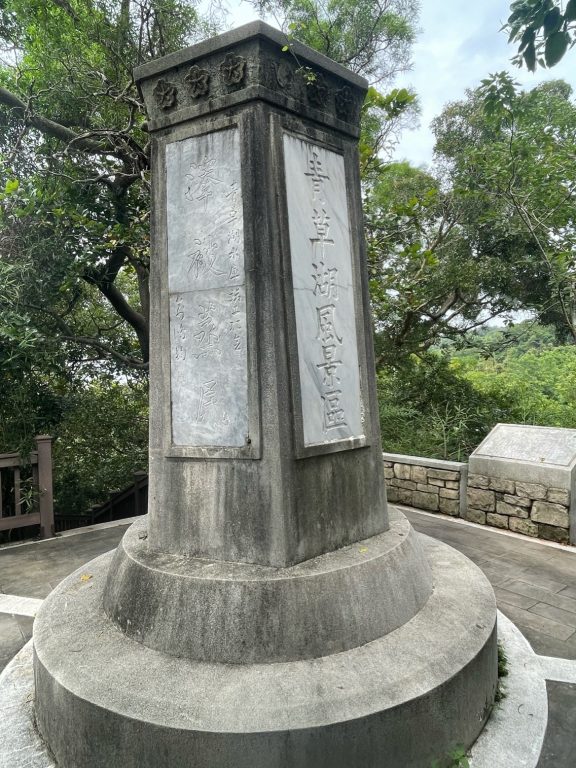 這個舊有富有歷史的紀念碑,坐落在明湖路入口處的一制高點,過去在青草湖水庫落成後,由蔣夢麟所提字,可看青草湖全景,四周皆種植鳳凰樹,碑上敘述著建青草湖的始末。