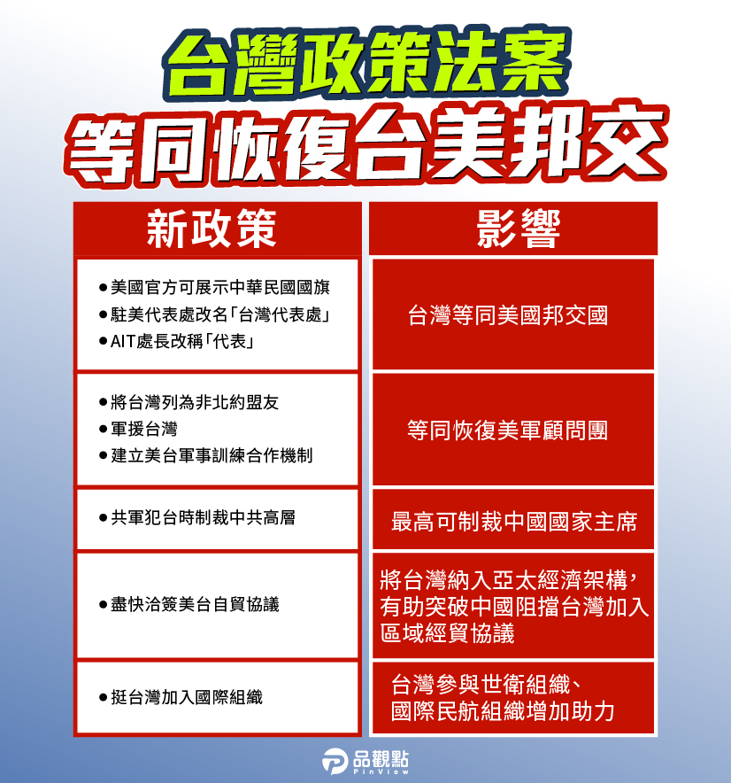 至於支持台灣加入國際組織的法案內容,也讓台灣在爭取加入世衛組織、國際民航組織時,多了一份來自美方的助力。