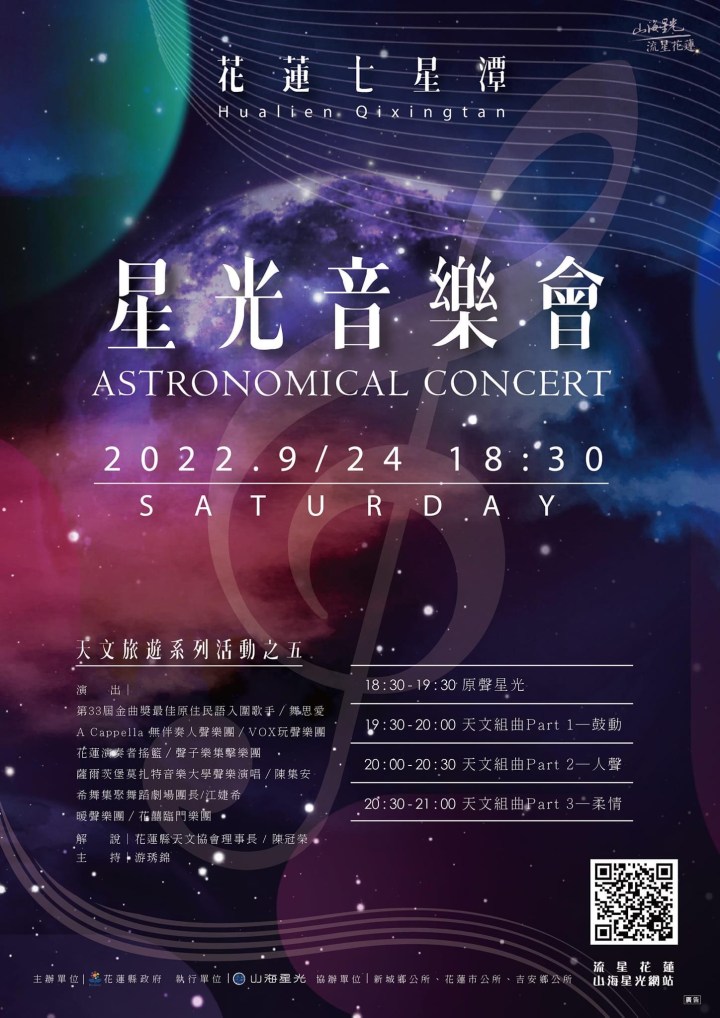 花蓮縣政府舉辦「星光音樂會」將於9月24日18時30分至21時在花蓮縣七星潭風景區賞星廣場旁海灘舉辦,從現代曲風到古典聲樂,以不同曲風詮釋以天文為主題的音樂,並有天文老師導覽星空,提供聽覺及視覺的星光饗宴,現場還有小小聯合國星光市集,歡迎大家帶著野餐墊,在療癒星空下欣賞樂曲,同時滿足心靈和味蕾。