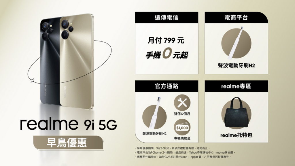 realme 9i 5G推出光澤金與搖滾黑雙色,配置6+128GB記憶體,售價新台幣7,990元。9月23日起正式上市,可至realme品牌專櫃,或線上通路realme網路商店、PChome 24h購物、蝦皮商城、Yahoo奇摩購物中心、momo購物網等選購,9月23起至9月30日止早鳥購機加贈realme聲波電動牙刷N2;官方通路註1再加碼延長保固12個月,合計兩年的原廠保固,使用更安心。電信通路將在9月30日於遠傳電信獨家開賣,搭配心5G 月付799指定資費方案,手機0元帶回家,再享遠傳friDay影音2個月$0暢看與手機保險首月免費優惠。