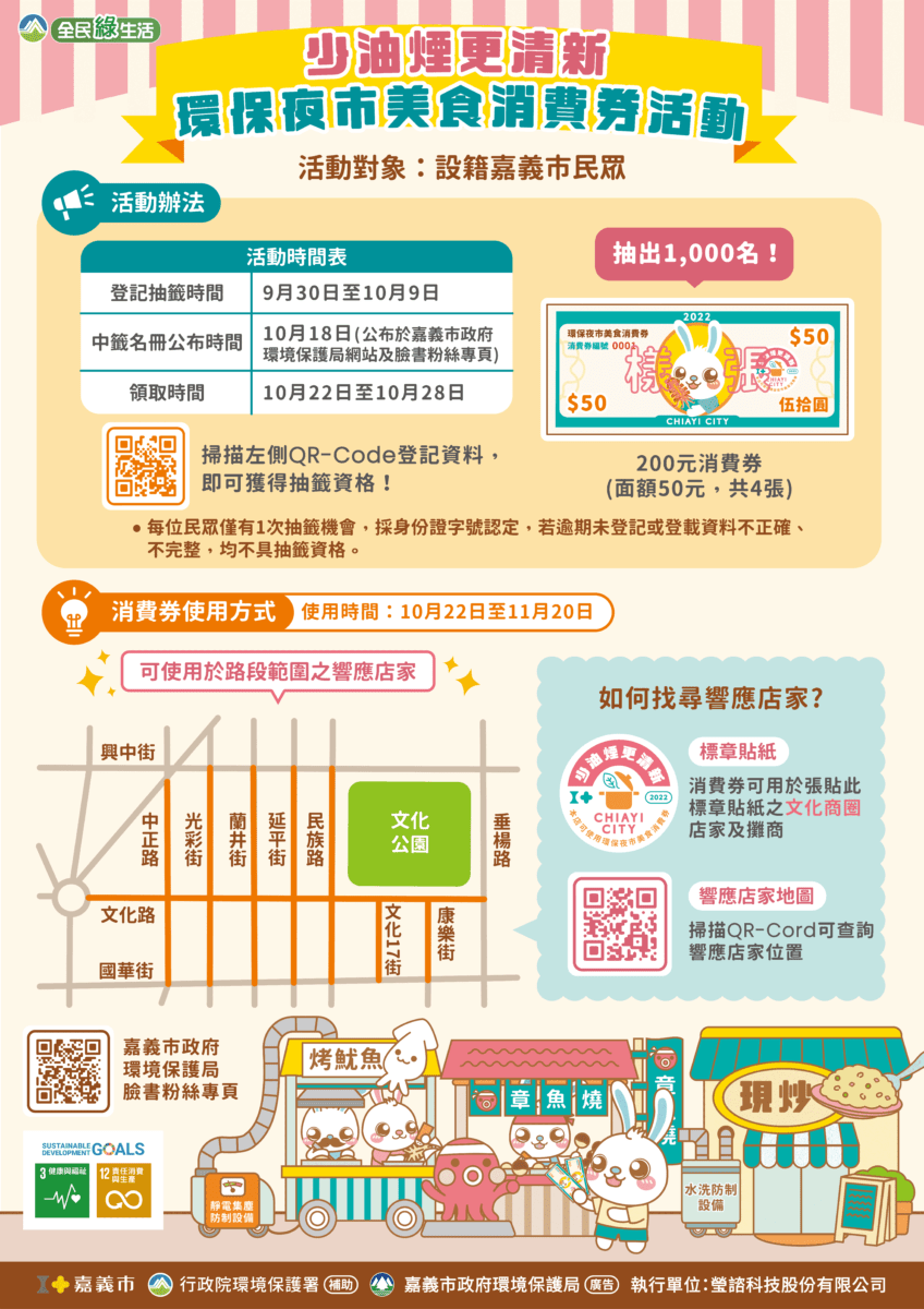 「環保夜市美食消費劵活動」預計發放1000份面額200元消費劵,採網路登記抽籤制,只要設籍嘉義市的市民朋友都可登記,登記期間自9月30日至10月9日止,將於10月18日公布中籤名單,並以簡訊通知。獲得美食消費券的市民朋友自10月22日領取當天起至11月20日止,即可至文化商圈貼有活動響應標章的餐飲店家使用。