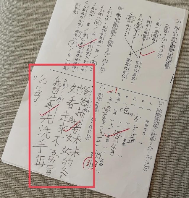 Grace透露,阿翔正在整理7歲的兒子布朗尼的書包,看著考卷背影在抖,但不知道正面是偷笑還是落淚,她貼出兒子的考卷,只見某一題造句題目為,「⋯⋯看起來⋯⋯」,布朗尼寫著:「爸爸拍著妹妹的背,她看起來不耐煩。」Grace逗趣造樣造句笑說,「我只知道,兒子,你!看起來應該是皮在癢了。」