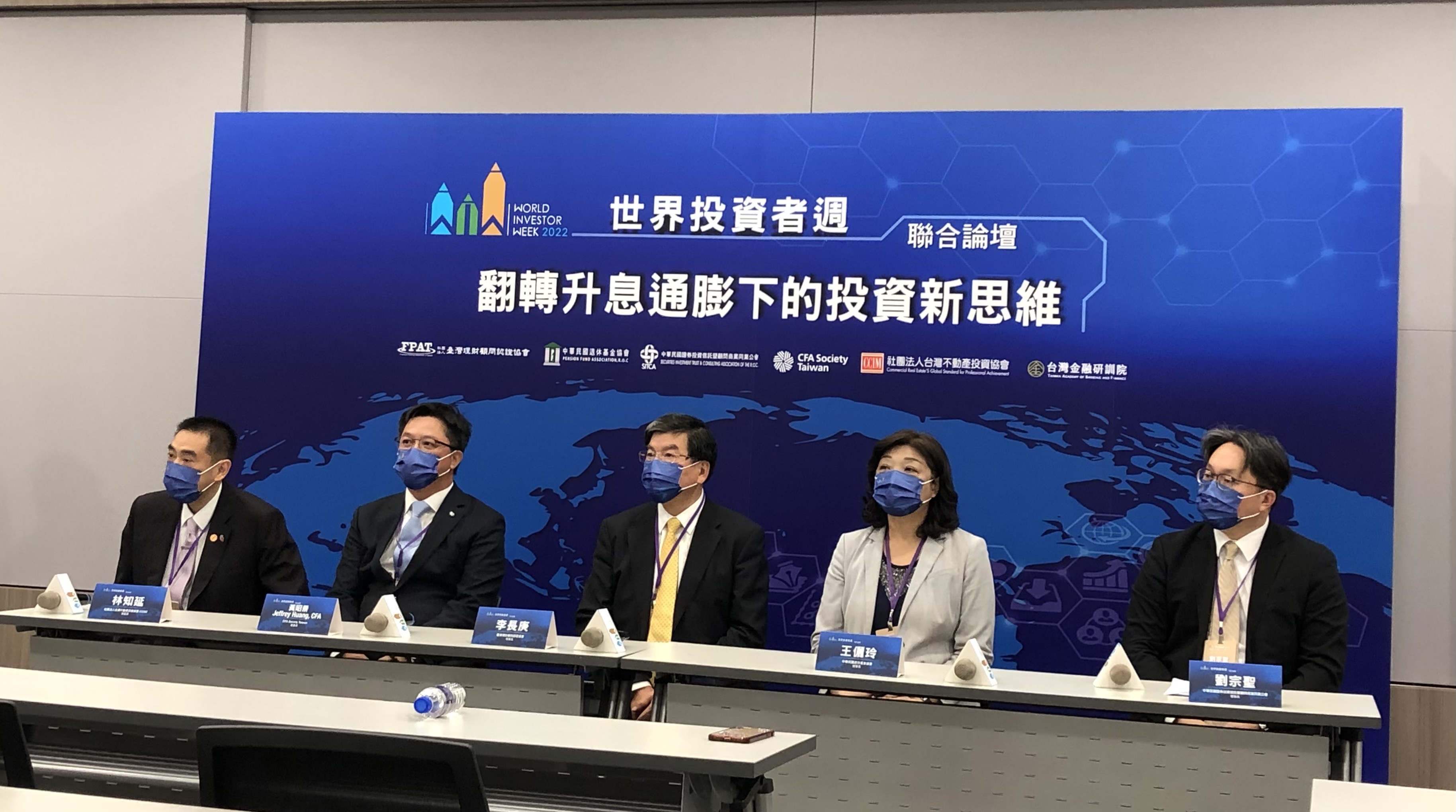 ▲圖說:圖左起依序為台灣不動產投資協會理事長林知延、CFA Society Taiwan理事長黃昭景、台灣理財顧問認證協會理事長李長庚、退休基金協會理事長王儷玲、投信公會理事長劉宗聖,今天一同出席「2022世界投資者週聯合論壇」記者會。(圖/記者李錦奇攝)