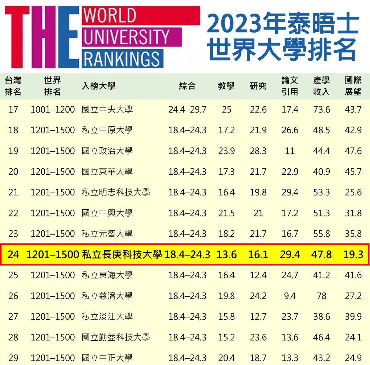 英國泰晤士報於昨(12)日公布2023年世界大學排名,台灣共有43所大學入榜,創下上榜數新高。其中長庚科技大學以第1201–1500名奪下了全國科大第五名,私立科大第二名,且「論文引用」項目上更獲得了29.4,成績超越了許多國立頂尖大學。長庚科大表示,該校上(9)月在「上海軟科」2022年世界學科排名護理類領域也榮獲第51-75名的殊榮,顯現學校研究表現亮眼,均獲得國際肯定。