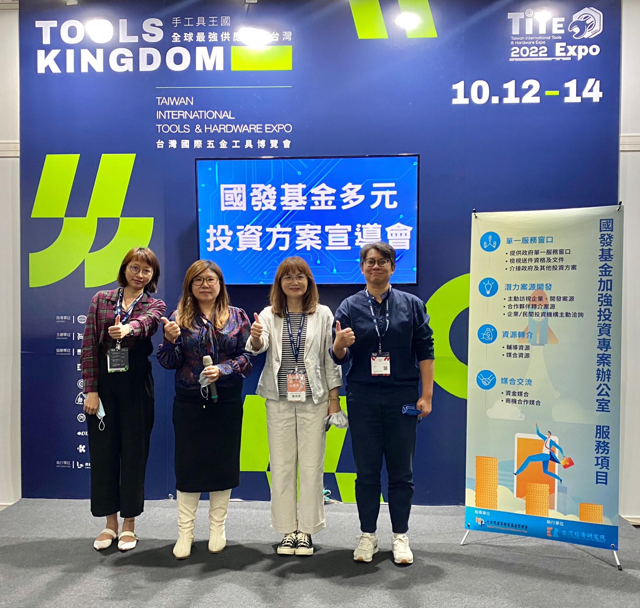 智慧製造在工業4.0時代扮演關鍵角色,工業從機械化、自動化、數位化發展到現在的智慧化,不僅需要軟硬結合、虛實整合,為因應場景差異化,所需導入技術也不盡相同。政府資金如何透過投資點火,協助企業創新轉型及促進產業創新加值,顯得相當重要。有鑑於此,國發基金加強投資專案辦公室與台灣手工具工業同業公會合作,13日在台中國際展覽館舉辦「台灣國際五金工具博覽會」,會中安排「國發基金多元投資方案」宣導會,提升業者對國發基金投資方案之認知,以帶動業者申請投資。