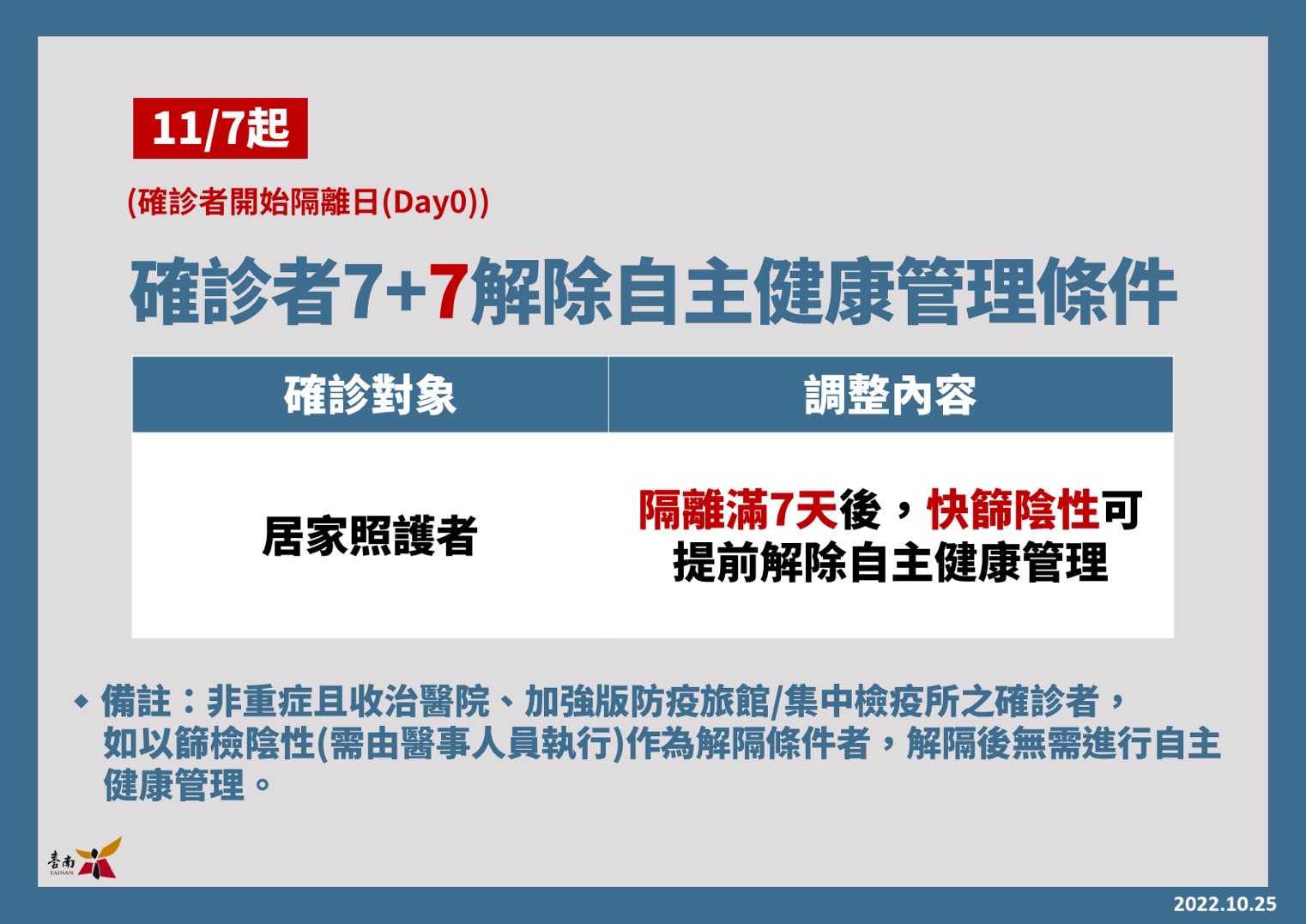 衛生局說明,確診者居家照護隔離滿7天後,快篩陰性即可提前解除自主健康管理;收治於醫院、加強型防疫旅館、集中檢疫所之非重症確診者,如以篩檢陰性(需由醫事人員執行)作為解隔條件,解隔後無需進行自主健康管理;確診者的同住親友(接觸者)將調整為全面採行「7天自主防疫」,不再開立居家隔離通知書;自主防疫期間無症狀者,須有2日內快篩陰性證明才可外出,外出時須遵守自主防疫規範、儘量避免接觸重症高風險對象。