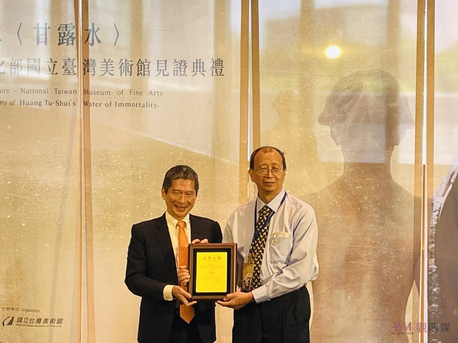 ▲文化部長李永得(左)致贈感謝牌予黃土水〈甘露水〉保存者家屬代表張士文先生。
