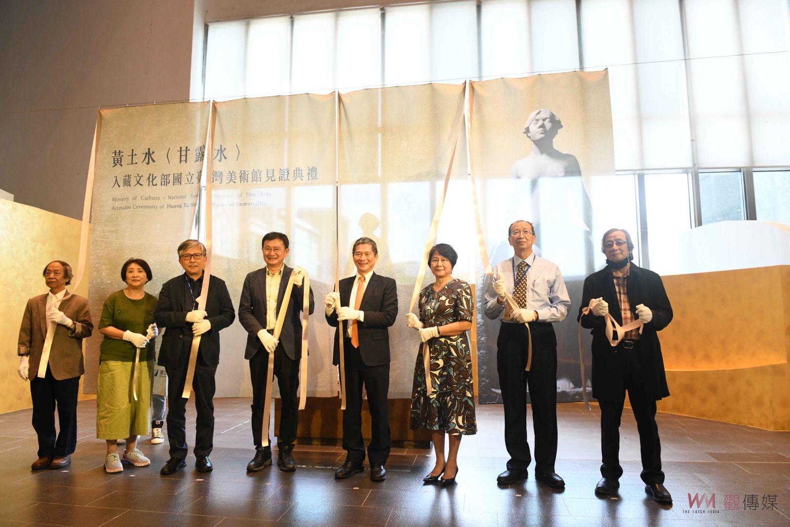(台中新聞)【記者顏淑娟/台中報導】文化部所屬國立臺灣美術館今(29)日舉辦「黃土水〈甘露水〉入藏文化部國立臺灣美術館見證典禮」,由文化部長李永得主持,國立臺灣美術館長廖仁義、保存者張鴻標家屬張士文先生、黃土水家屬林麗純女士、國家文化藝術基金會董事長林曼麗、臺灣美術史家謝里法等嘉賓出席,共同見證此歷史時刻,及「重建臺灣藝術史計畫」的重要成果,彰顯藝術家嘔心瀝血的生命,以及這件經典作品的藝術史價值。