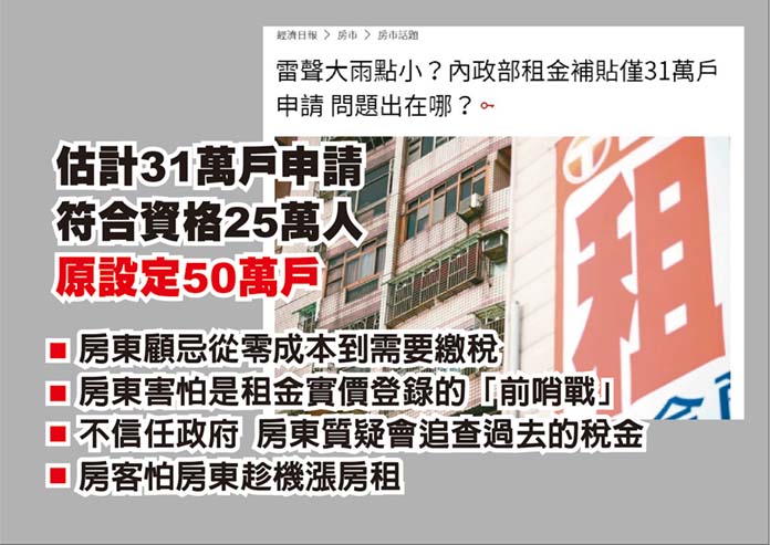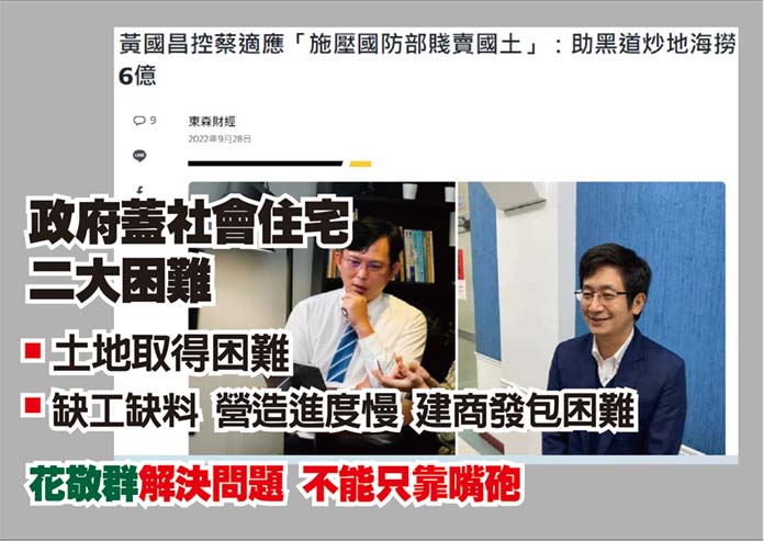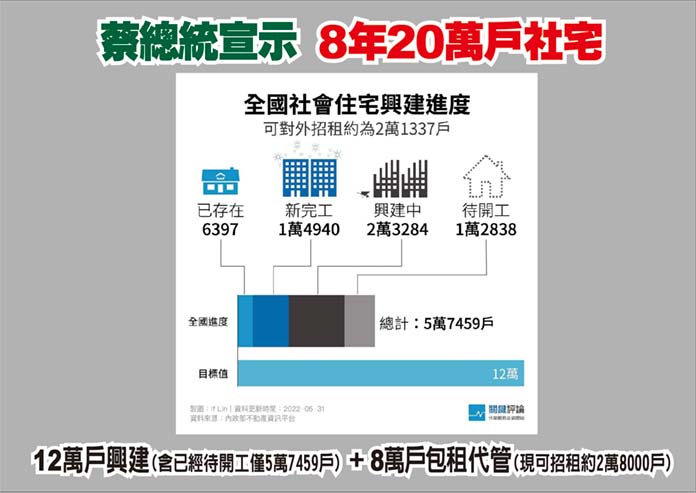 他並說,蔡總統2016年選總統時曾承諾,8年內蓋20萬戶社會住宅,現在執政邁入第7年,20萬戶社會住宅中12萬戶興建,另外8萬戶是「包租代管」;而12萬戶興建或開發中的社會住宅,僅有5.7萬多戶,8萬戶「包租代管」僅有2.8萬戶,總計8.5萬戶,成績僅有42分。