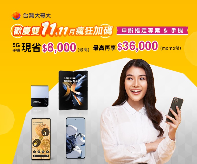 11月30日前到台灣大申辦999元以上指定專案搭購指定機款,即可享高額折扣,包括 Google Pixel 6 Pro 手機現折8000元;三星旗艦摺疊機Galaxy Z Flip 4、Galaxy Z Fold 4,以及Xiaomi全新上市的「影像系統神機」12T等指定機款享現折2000元;此外Sony Xperia 10 IV旗艦機、OPPO Reno8等指定機款享折價1000元。