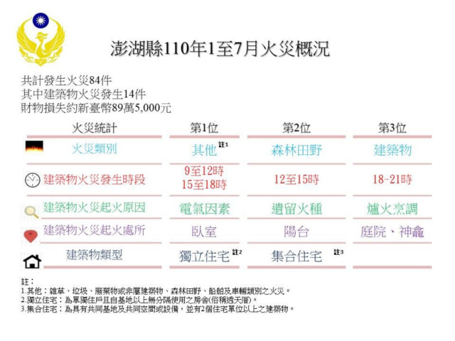 【今傳媒/記者董寶明報導】澎湖縣政府消防局統計,1月至7月達火災認定標準案件共84件、無人死亡,造成7人受傷,財物損失約新臺幣89萬5仟元,分析火災原因以燒雜草與廢棄物45件最多,占約54%。另住宅火警14件,其起火原因分別為電氣因素、遺留火種及爐火烹調,其中,以「電氣因素」列居第1位,經分析容易產生「電氣因素」火災案件因素為:不正確使用電器習慣、空氣相對濕度高、老舊建築物牆壁滲(漏)水、堆放過多雜物等,一旦不注意,就容易造成火災。