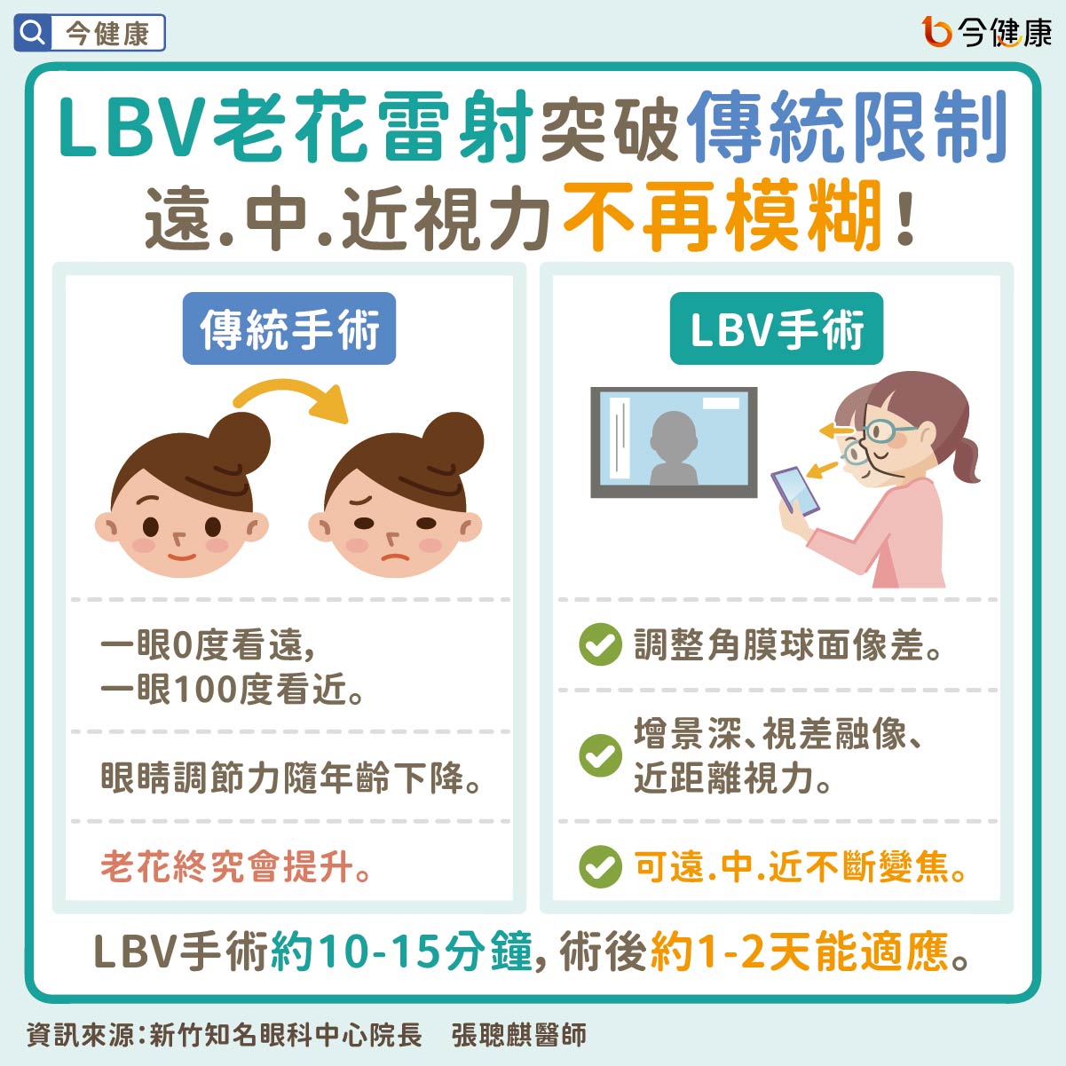 不同於傳統老花雷射手術,LBV老花雷射可以藉由調整角膜球面像差來增加景深,不僅進一步增進雙眼視差融像的效果,也讓近距離視力更加提升,這兩大改善徹底突破多年來45歲以上患者傳統老花雷射矯正不足的困境,更加貼近手機世代族群需要頻繁在遠中近三種距離不斷轉變焦距視物的用眼需求。此外,即使是曾經接受過雷射手術的患者也可以藉由細密調整恢復遠中近視力,施術過程僅約10至15分鐘,患者在術後約1到2天就能適應。呼籲對老花治療有期待的民眾能與眼科醫師討論,選擇合適的治療方案!