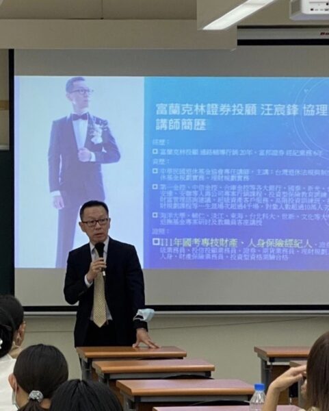 最後由富蘭克林投顧公司汪宸鋒協理以「預約富足人生」為主軸,從人生的收支曲線、理財工具的選擇、財富規劃的步驟、投資原則及個人風險管理來達成富足人生的關鍵和財務自由的目標。