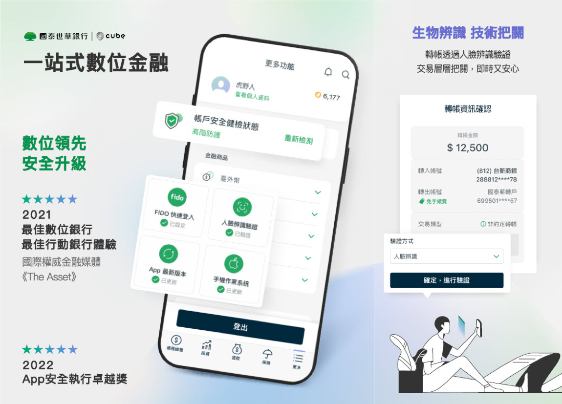 FIDO生物認證登入:國泰世華CUBE App(原網銀App)採用「FIDO」國際級資安標準規格的生物辨識登入,有別於過去的傳統密碼驗證登入方式,手動鍵入不但費時費力,,若不慎外流還會有被盜用的風險。FIDO使用更安全的無密碼生物驗證技術,伺服器不須存取使用者資訊,使用者也不再需要另外記密碼,以生物辨識即可快速又安全的登入,免除需要記憶一長串複雜密碼,也避免密碼輸入錯誤的可能。