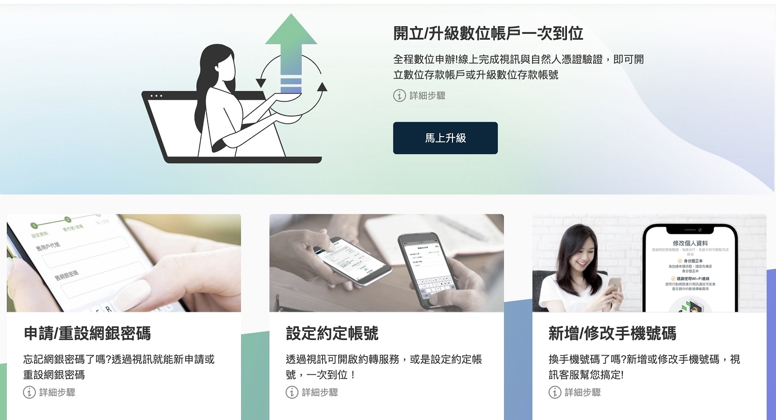 直接人臉辨識:人臉辨識的特色在於安全性與易用性高,註冊會透過臨櫃或視訊確保為本人申請,交易時則透過生物特徵比對留存資料;此外,只要手機有前鏡頭就可以使用,讓傳統許多只能臨櫃操作的業務能夠數位化辦理,滿足用戶多元數位服務與帳戶安全的需求。