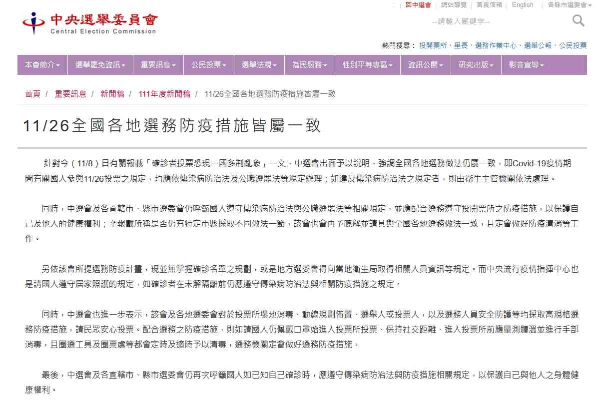 另外,九合一大選迫在眉睫,民眾關注要如何在疫情防疫規範下投票,中選會對此說明,全國各地選務做法將會一致,均應依照《傳染病防治法》與《公職選罷法》等規定辦理,國人進入投票所前需量測體溫,在投票所內也必須配戴口罩、保持社交距離。中選會也強調,中選會與各地選委會對於投票所的場地消毒、動線規劃,以及投票權人與選務人員的安全防護等,均採高規格選務防疫措施,圈選工具與圈票處等都會定時、適時進行消毒。至於如何掌握確診者進出投票所,指揮中心已定調全國一致做法,「不會把確診者名單提供給中選會」,王必勝呼籲已確診的民眾在家中隔離滿5天、驗陰後才能出門,一定要照規定走。