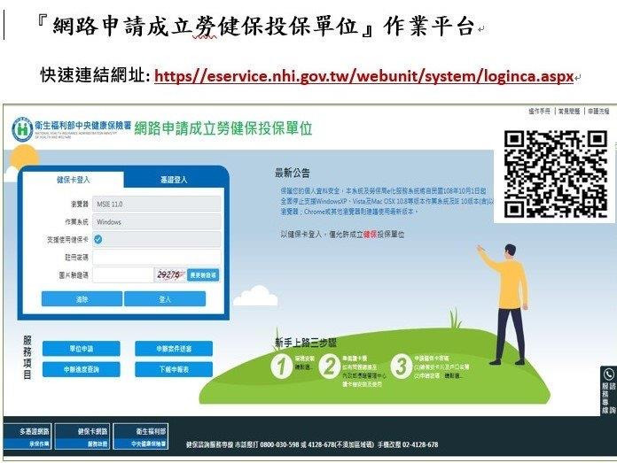 張温温組長進一步說明,企業主只要使用個人已註冊之健保卡,透過讀卡機登入健保署『網路申請成立勞健保投保單位』作業系統(路徑:健保署官網首頁www.nhi.gov.tw/健保服務/投保與保費/投保單位成立與異動/網路成立勞健保投保單位),填寫申請資料及首次人員加保資料後線上送出,即可輕鬆完成健保新成立投保手續;若使用單位工商憑證還可以同時辦理新成立勞保投保單位。