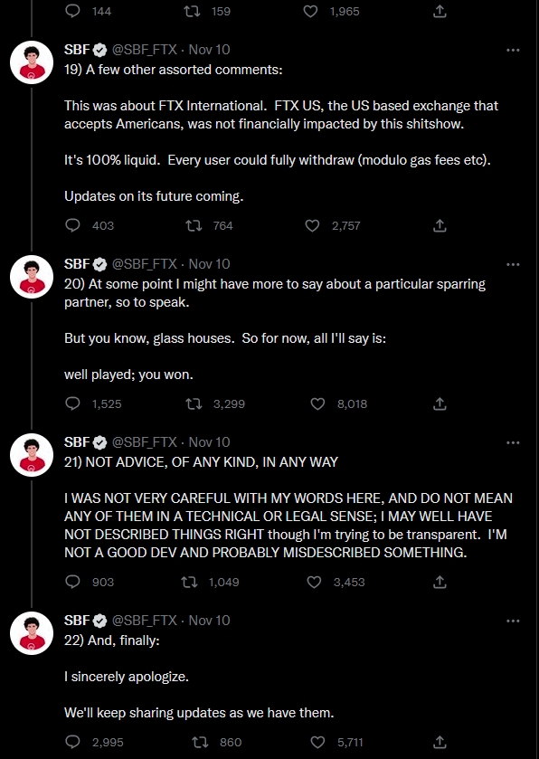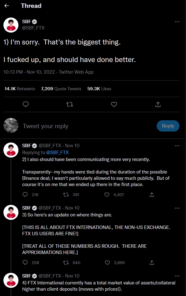 FTX身為全球第二大加密貨幣交易所,卻在一夕之間面臨破產倒閉的命運,創辦人山姆.班克曼弗里德(Sam Bankman-Fried,SBF)推文致歉,洋洋灑灑共列出22點聲明,強調接下來會盡可能將資金還給用戶,也向所有人致歉自己做錯了。