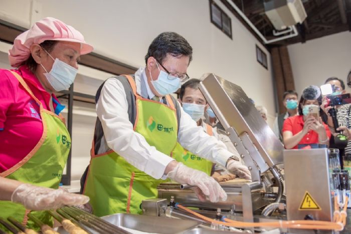 鄭文燦體驗製作小松菜蛋捲。圖:市府提供