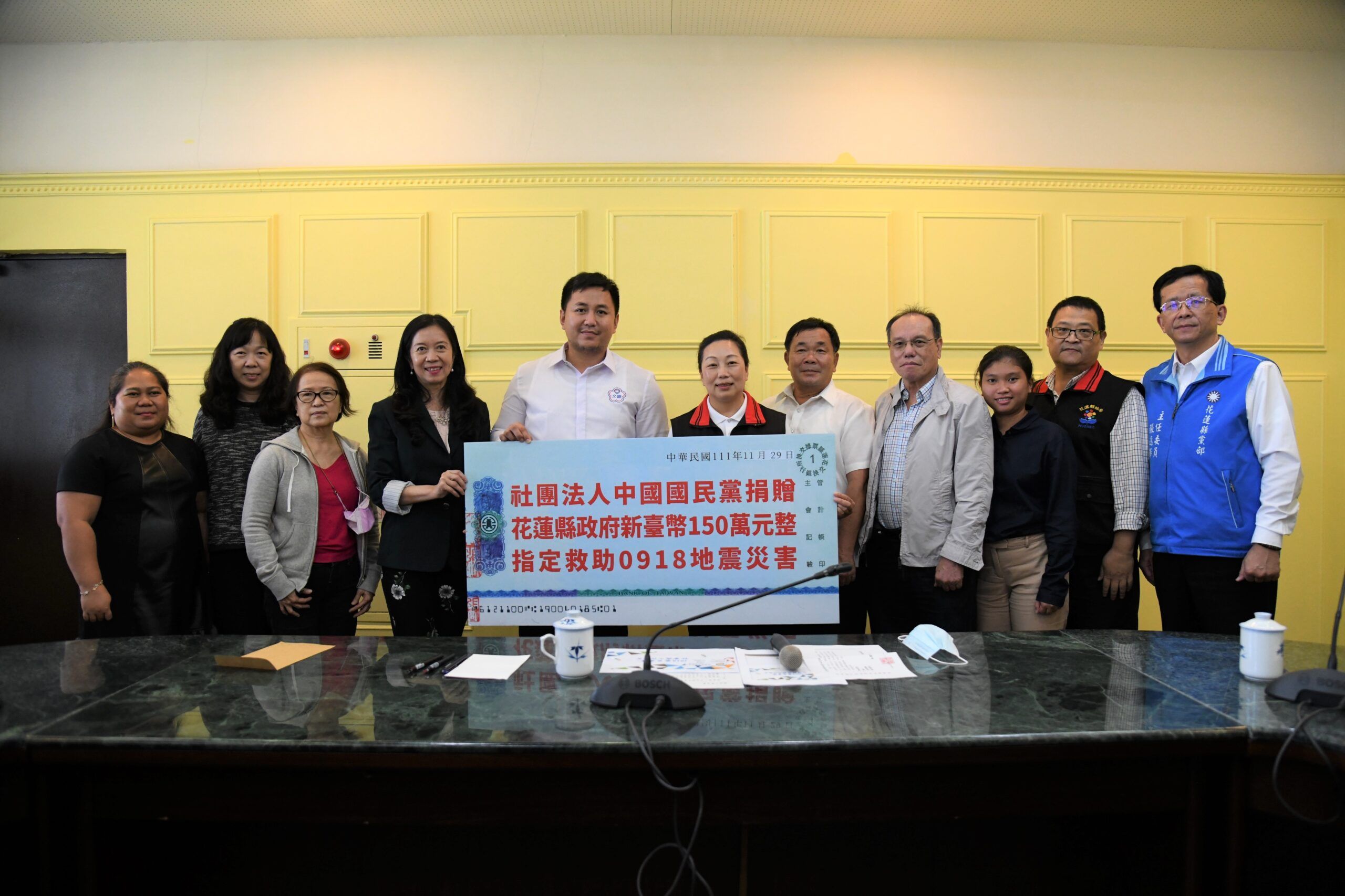 0918強震過後,花蓮縣政府全力協助5個受災鄉鎮的復建工程,中國國民黨黨部及海外菲律賓與舊金山分支成員掛心花蓮災情,今(29)日特別至縣府捐款新台幣150萬元援建,義行可風,縣長徐榛蔚代表受贈時,滿心感激。
