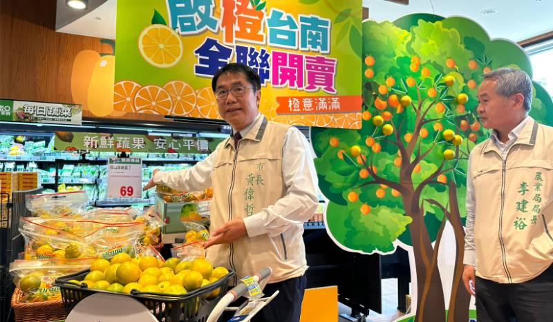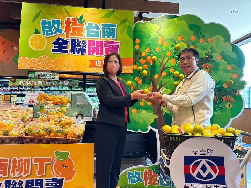 【大成報/記者于郁金/臺南報導】臺南柳橙盛產季節就是現在!今(9)日於全聯福利中心新營民生門市,辦理烏山頭雞蛋丁開賣記者會,由臺南市政府市長黃偉哲從果樹上摘下柳橙,並交給全聯福利中心雲嘉處長林麗珠,象徵臺南烏山頭雞蛋丁今日起於全臺全聯門市開賣,市長黃偉哲歡迎全國民眾多多選購。