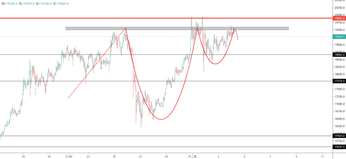 之前我們曾多次提到上方存在日線高點阻力19892.0,此價位為17年牛市高點。目前我們看到BTCUSD的一小時K線圖,在圖表內呈現出的是一個典型的杯柄型態,整體仍屬於一大週期上漲型態。此杯延高點可以以上方日線阻力為突破點,若上方日線阻力19892.0突破且站穩,可以判斷多頭將大概率延續。