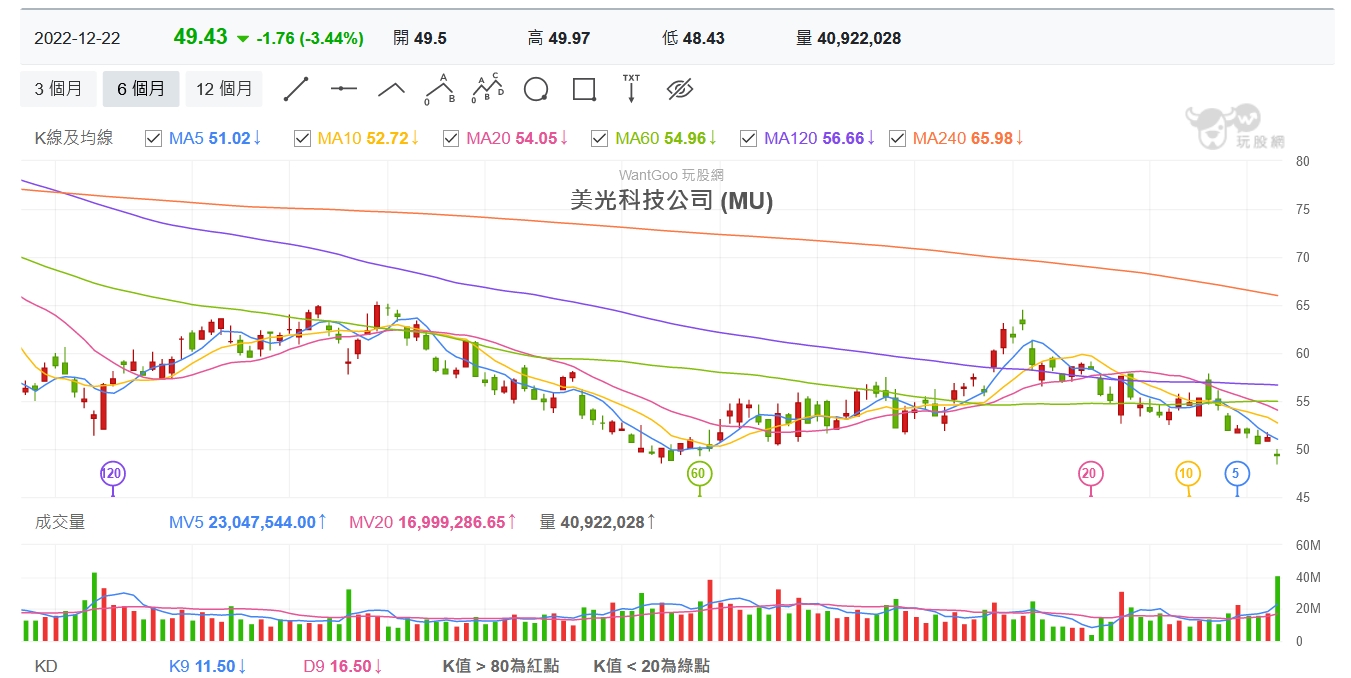 美光第一財季營收年減47%,為40.9億美元,經調整後每股虧損0.04美元,表現均不如市場預期,裁員消息一出,美光跳空大跌3.44%,收在49.43美元。圖片來源:翻攝玩股網
