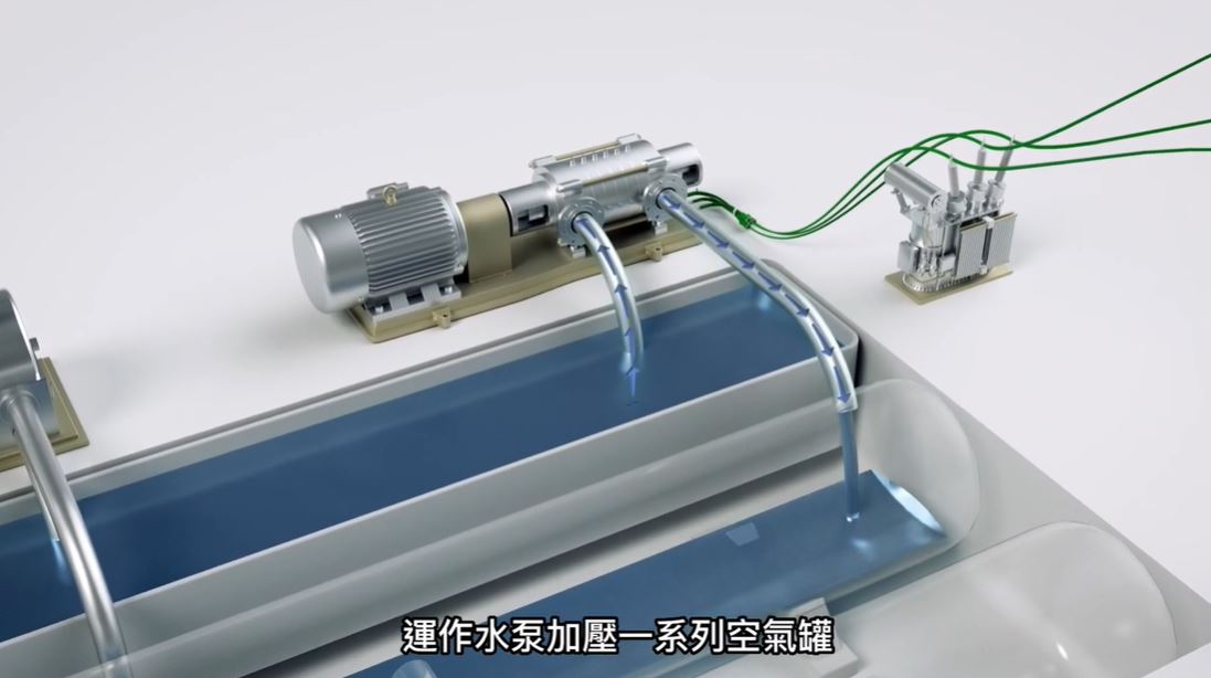 ▼圖説:Power 8系統的運作原理,是加壓空氣罐,把水推送到水輪機發電。(翻攝YouTube/P8Video ch)