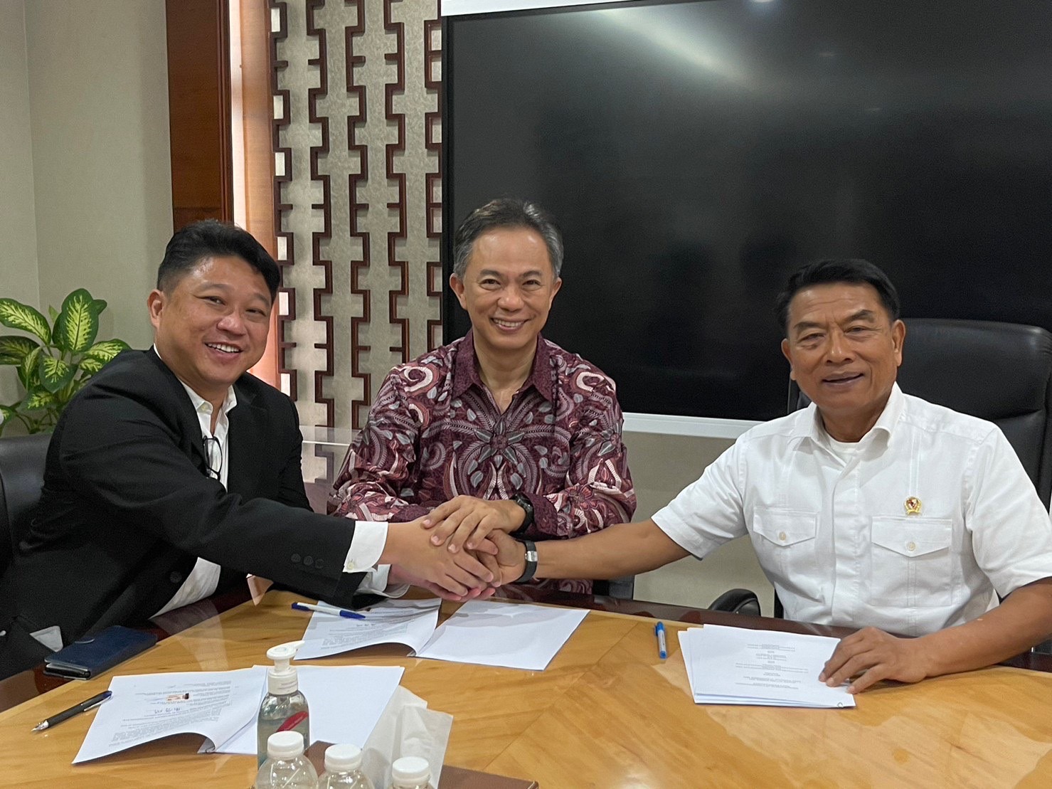 ▲圖説:圖左起為印尼總統府幕僚長穆爾多科(Moeldoko),與美格儲能創辦人丁廉君、新加坡永續集團營運長楊偉雄(Baron Chang)簽約,將由美格興建100GW光儲能系統,提供印尼電力10%全天侯綠能。(圖片來源/美格儲能提供)