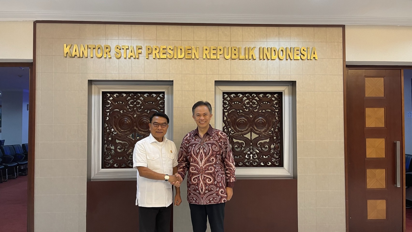▼圖説:圖左起為印尼總統府幕僚長穆爾多科(Moeldoko),與美格儲能創辦人丁廉君(圖右),在印尼總統府合影。(圖片來源/美格儲能提供)