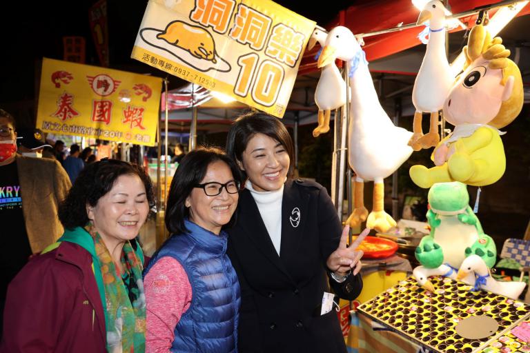許縣長一邊預祝排隊領摸彩券的民眾中大獎,一邊變身最美最配合的拍照吉祥物,雖然忙得不亦樂乎,許淑華縣長仍能從容大顯身手試擲套圈圈,還抽空為美食攤位簽名留念,巧扮最佳代言人。