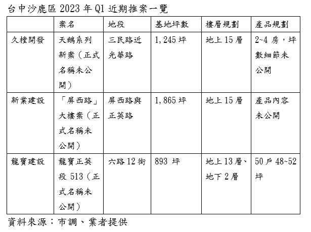 表/台中沙鹿區2023年Q1近期推案一覽。立智公關彙整提供