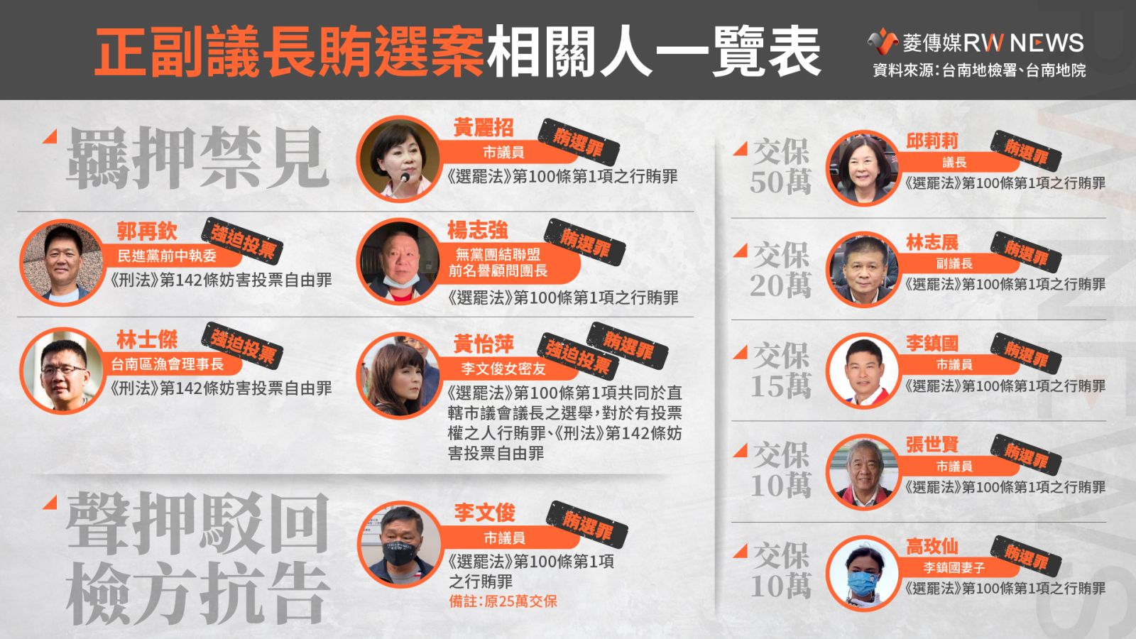 根據台南地院、台南地檢署相關書類顯示,檢調偵辦正副議長賄選案,主要依據《選罷法》第100條第1項「共同於直轄市議會議長選舉,對於有投票權之人行求罪」及《刑法》第142條「妨害投票自由罪,以強暴脅迫或其他非法方法,妨害他人自由行使法定之政治上選舉或其他投票權者。」
